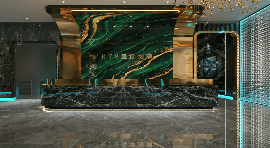 前臺(tái)區(qū)域,以黑色大理石搭配金色弧形裝飾,背景墻的綠色紋理石材與金色線條相得益彰,彰顯高端品質(zhì)。大廳中,大型影視屏幕與綠植點(diǎn)綴,營造舒適氛圍。