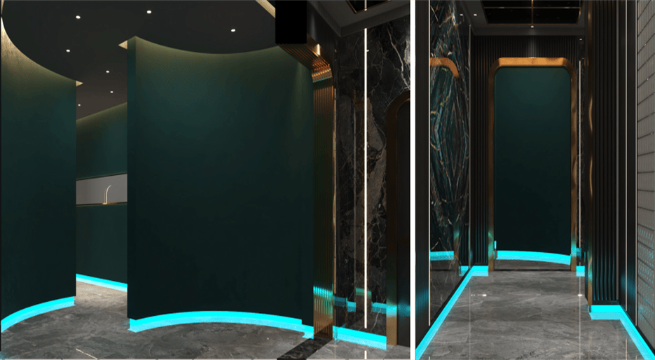 走廊及包間,深色大理石地面搭配藍(lán)色燈帶,營造出神秘且時(shí)尚的氛圍。包間內(nèi),木質(zhì)墻板搭配綠色石材背景墻,溫馨舒適,星空頂設(shè)計(jì)增添浪漫情調(diào)。KTV 包間,藍(lán)色霓虹燈帶與鏡面材質(zhì)結(jié)合,打造出炫酷的視聽空間,舒適的沙發(fā)座椅提升顧客體驗(yàn),整體設(shè)計(jì)旨在為顧客提供一個(gè)集休閑、娛樂、放松于一體的高品質(zhì)場(chǎng)所。