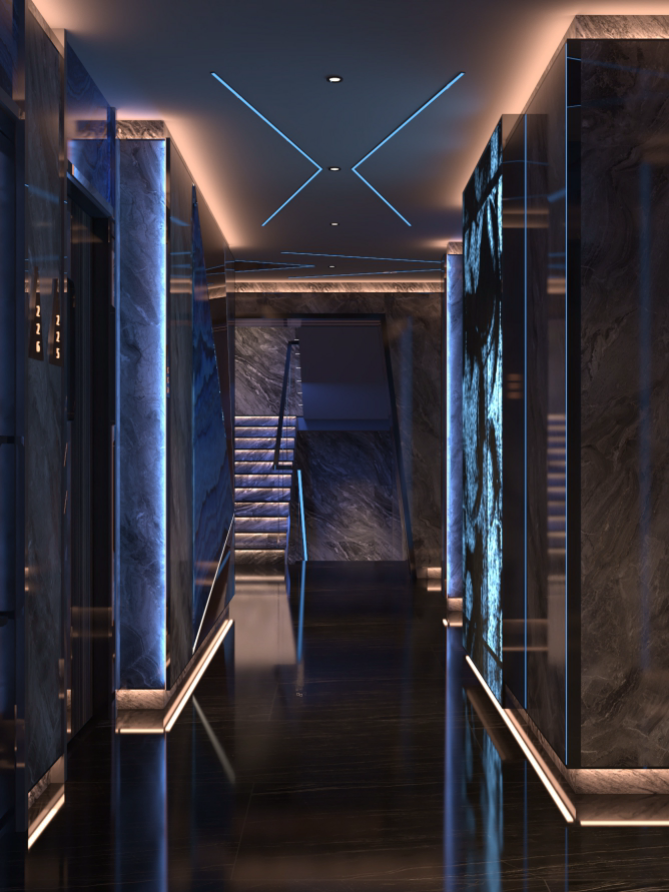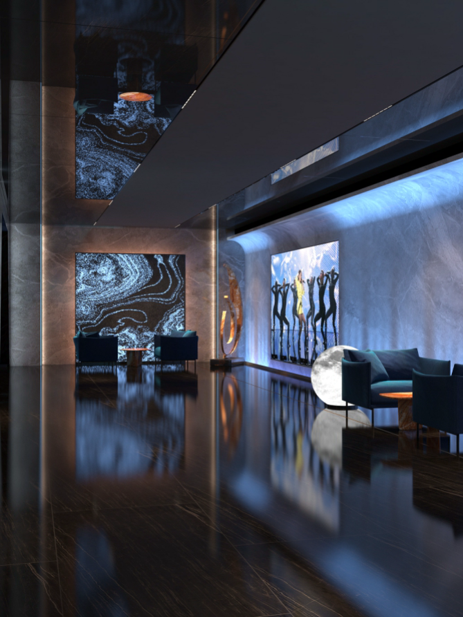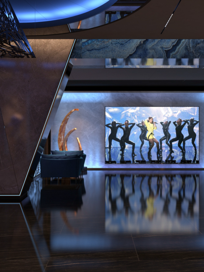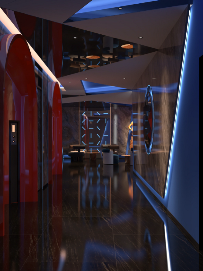 休息區(qū),墻面大型顯示屏播放動(dòng)感畫面,搭配舒適的藍(lán)色沙發(fā)與藝術(shù)雕塑,營(yíng)造出輕松愉悅的氛圍。走廊區(qū)域,深色大理石墻面結(jié)合藍(lán)色燈光線條,天花板的幾何造型燈帶與地面反射效果相呼應(yīng),增強(qiáng)空間的縱深感與科技感,墻壁上的藝術(shù)畫作和裝飾增添了文化韻味,整體設(shè)計(jì)旨在為顧客打造一個(gè)舒適、時(shí)尚且充滿活力的休閑娛樂(lè)空間。
