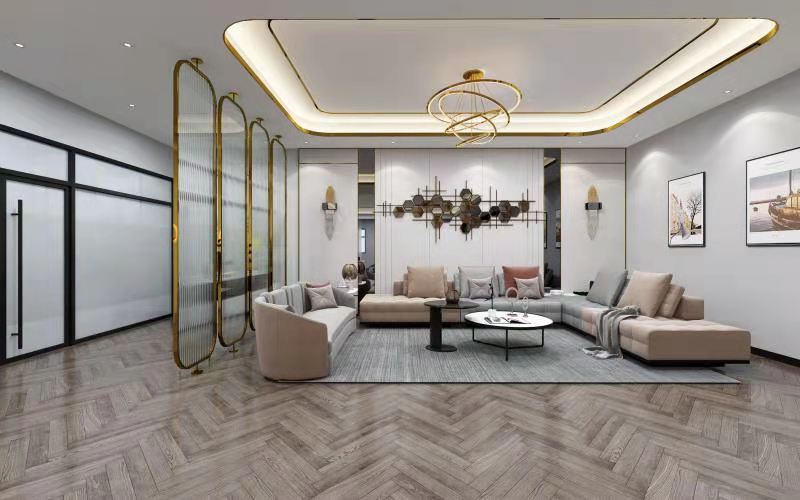 會(huì)客區(qū),沙發(fā)組合舒適,裝飾畫(huà)與吊燈提升格調(diào),營(yíng)造出輕松愉悅的洽談氛圍。
