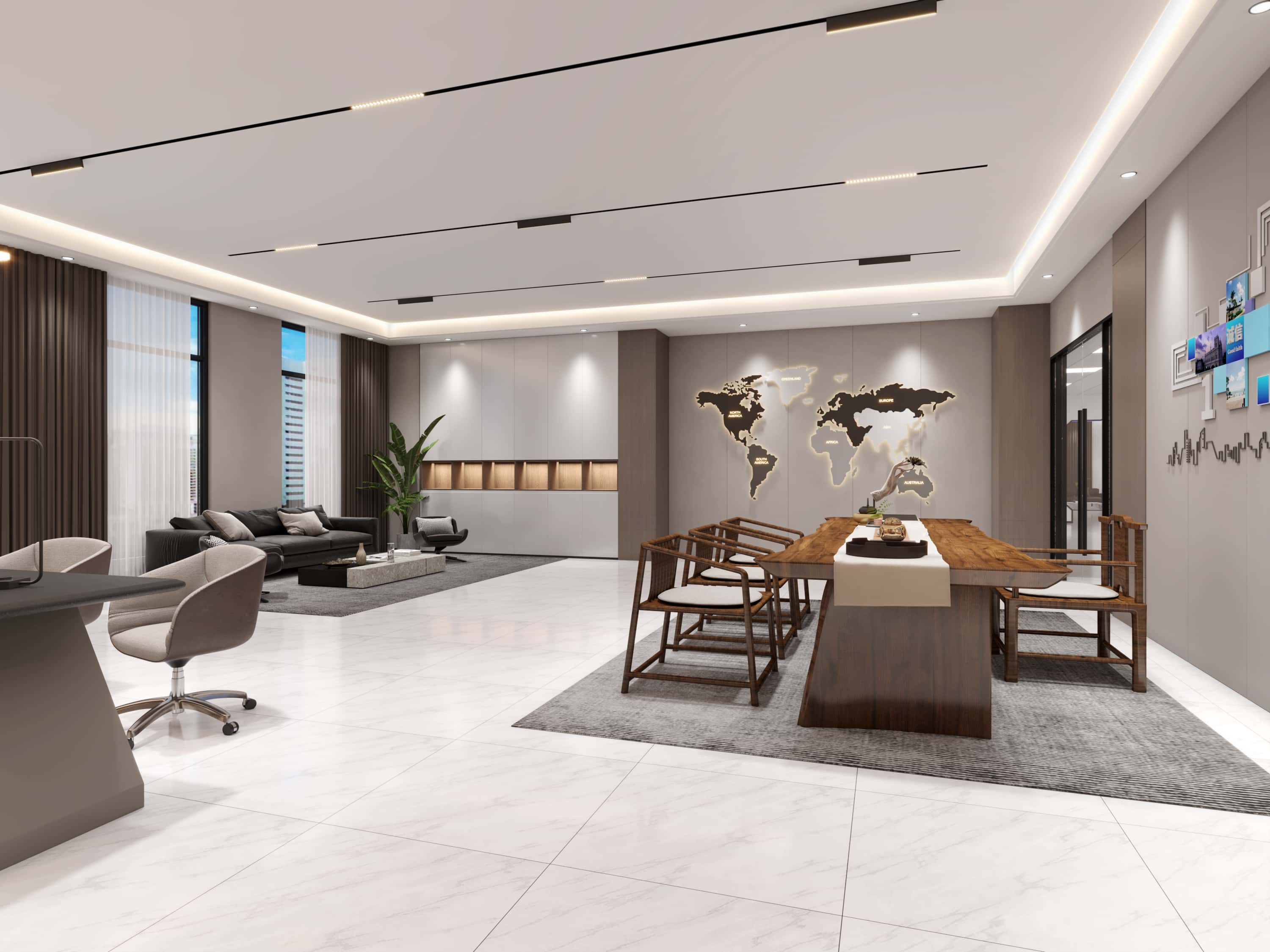 辦公區(qū),空間寬敞,家具擺放合理,采光良好。中式風(fēng)格的辦公桌椅與現(xiàn)代辦公設(shè)施結(jié)合,營造出獨(dú)特的辦公環(huán)境。