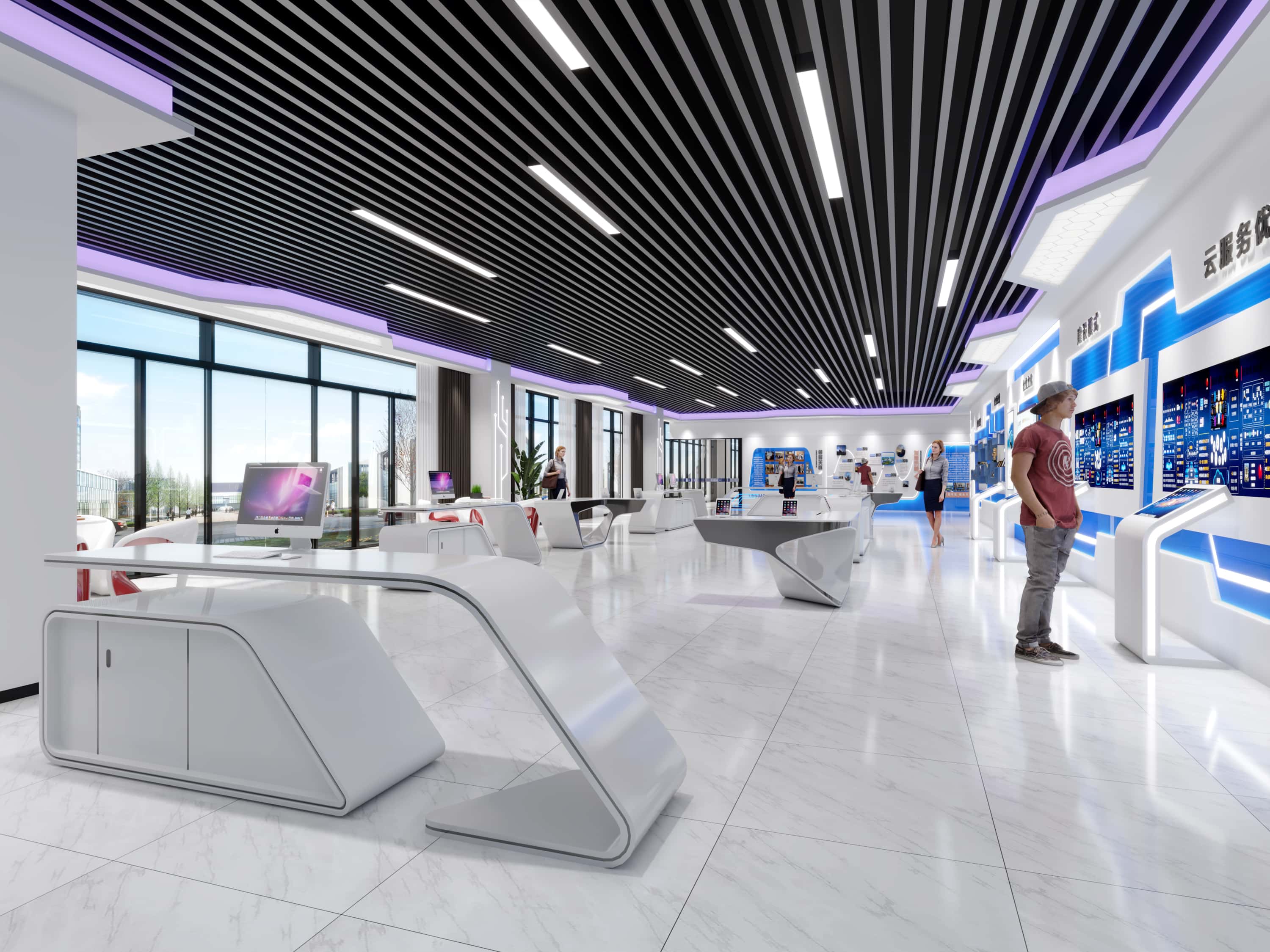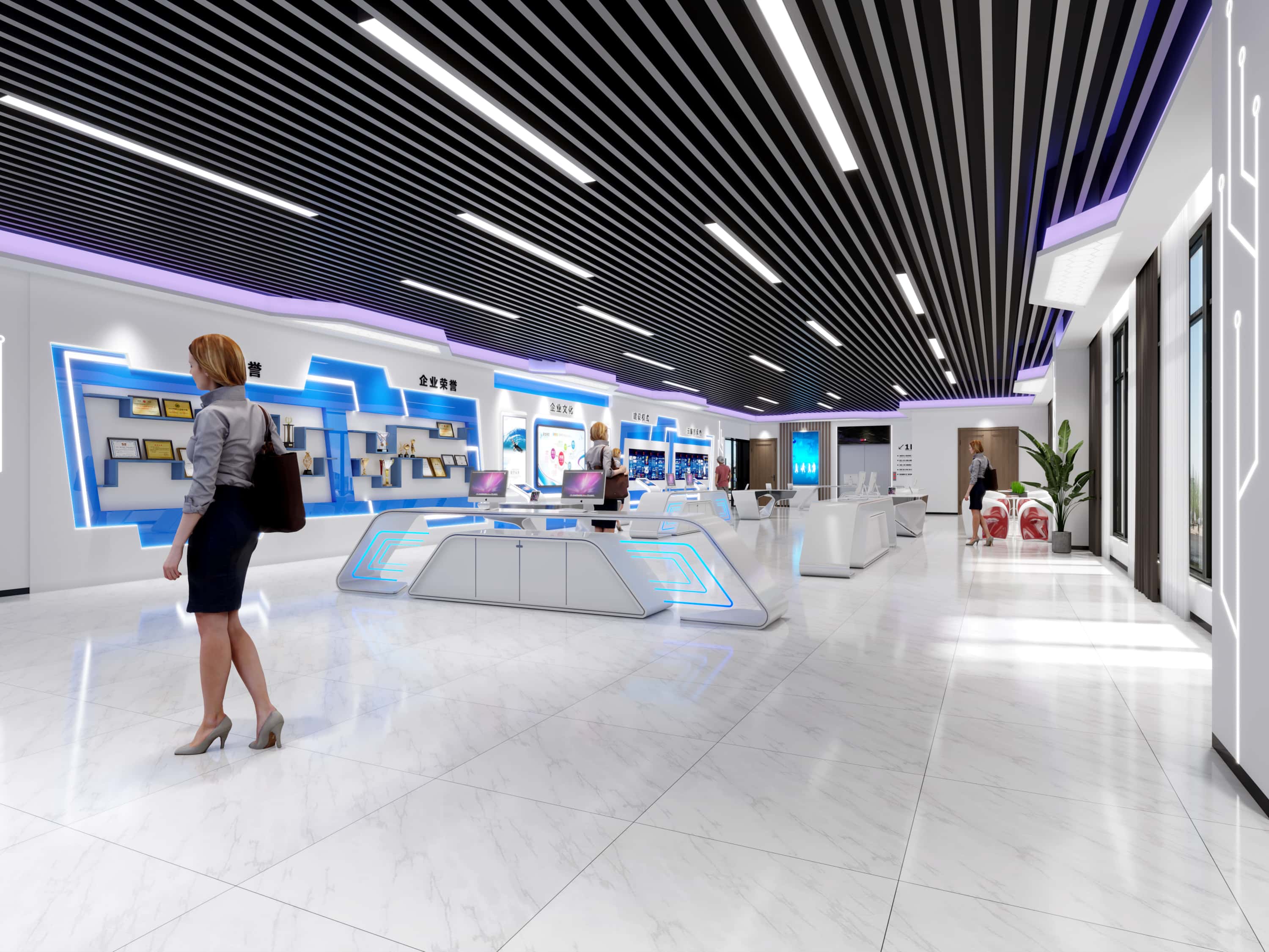 展廳區(qū)域,藍(lán)白配色凸顯科技感,展示臺造型新穎,墻面展板結(jié)合多媒體設(shè)備,全面展示企業(yè)信息。天花板的條形設(shè)計(jì)與燈光搭配,增強(qiáng)空間立體感。