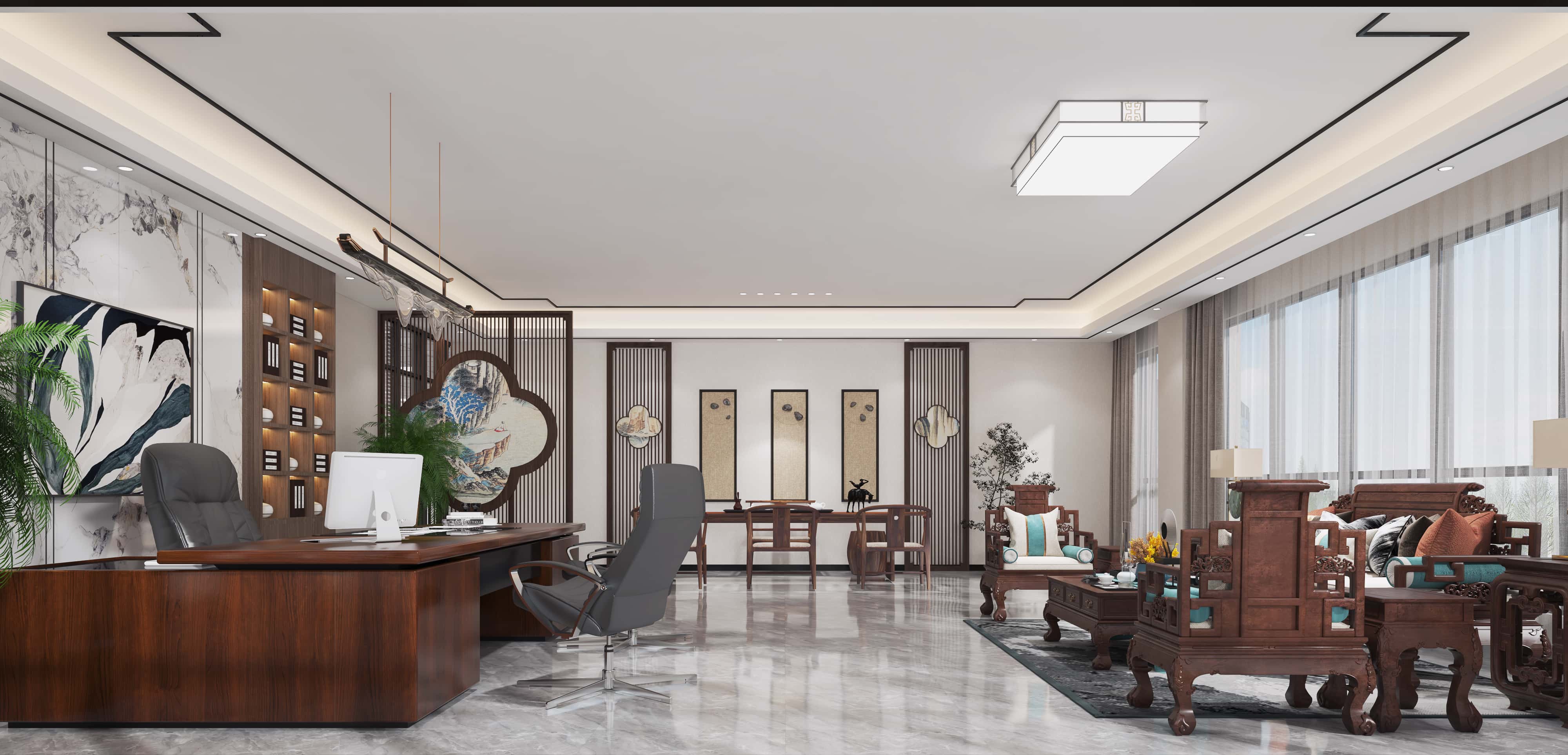 經(jīng)理辦公室,新中式風(fēng)格盡顯典雅,木質(zhì)家具古樸大氣,搭配中式屏風(fēng)、掛畫(huà)等裝飾,營(yíng)造出寧?kù)o雅致的辦公氛圍,同時(shí)滿足辦公與接待需求。