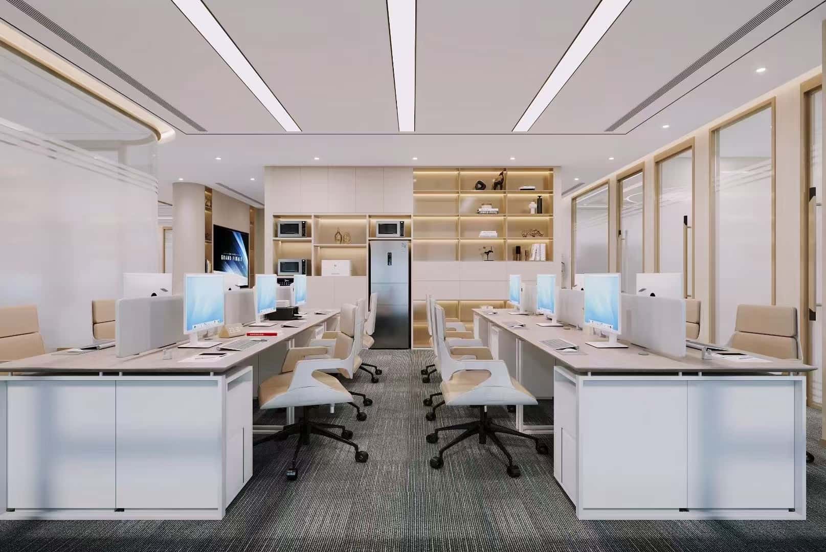 開放式辦公區(qū)布局合理,辦公桌整齊排列,白色的辦公桌搭配米色與白色相間的辦公椅,簡潔大方且舒適實用。天花板上的長條形燈帶設計,提供了均勻充足的照明,同時增強了空間的縱深感與現代感。