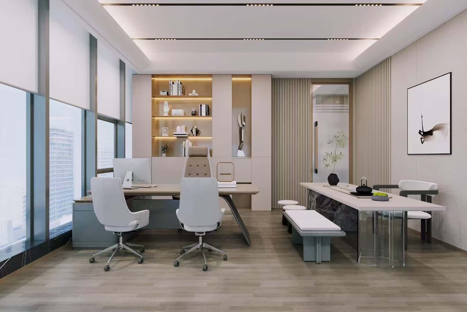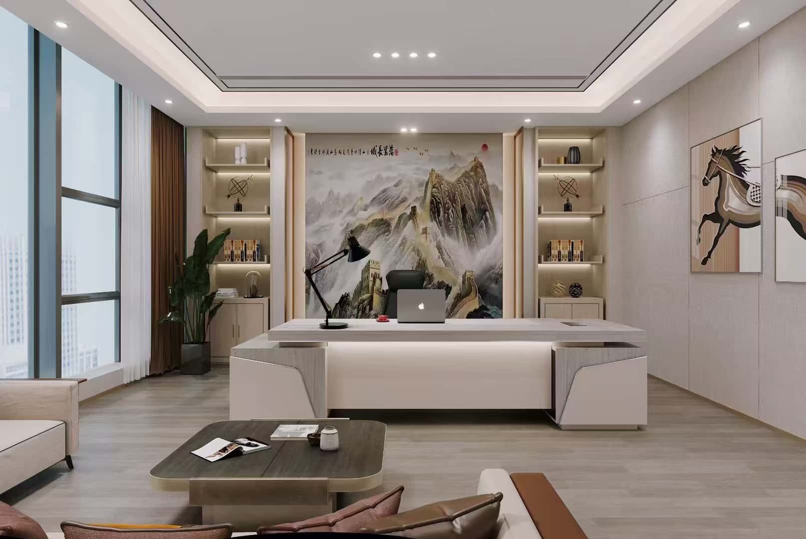 辦公家具選擇簡約而富有設計感的款式,辦公桌、辦公椅及沙發(fā)等家具的顏色搭配和諧,營造出舒適的辦公氛圍。書架上擺放的書籍、裝飾品等,豐富了空間的文化內涵,展現出企業(yè)的品味與格調。部分辦公室內的背景墻裝飾有大幅山水畫或藝術畫作,如長城畫作、駿馬畫作等,增添了藝術氣息與文化底蘊,體現了領導的品味與企業(yè)的文化內涵。