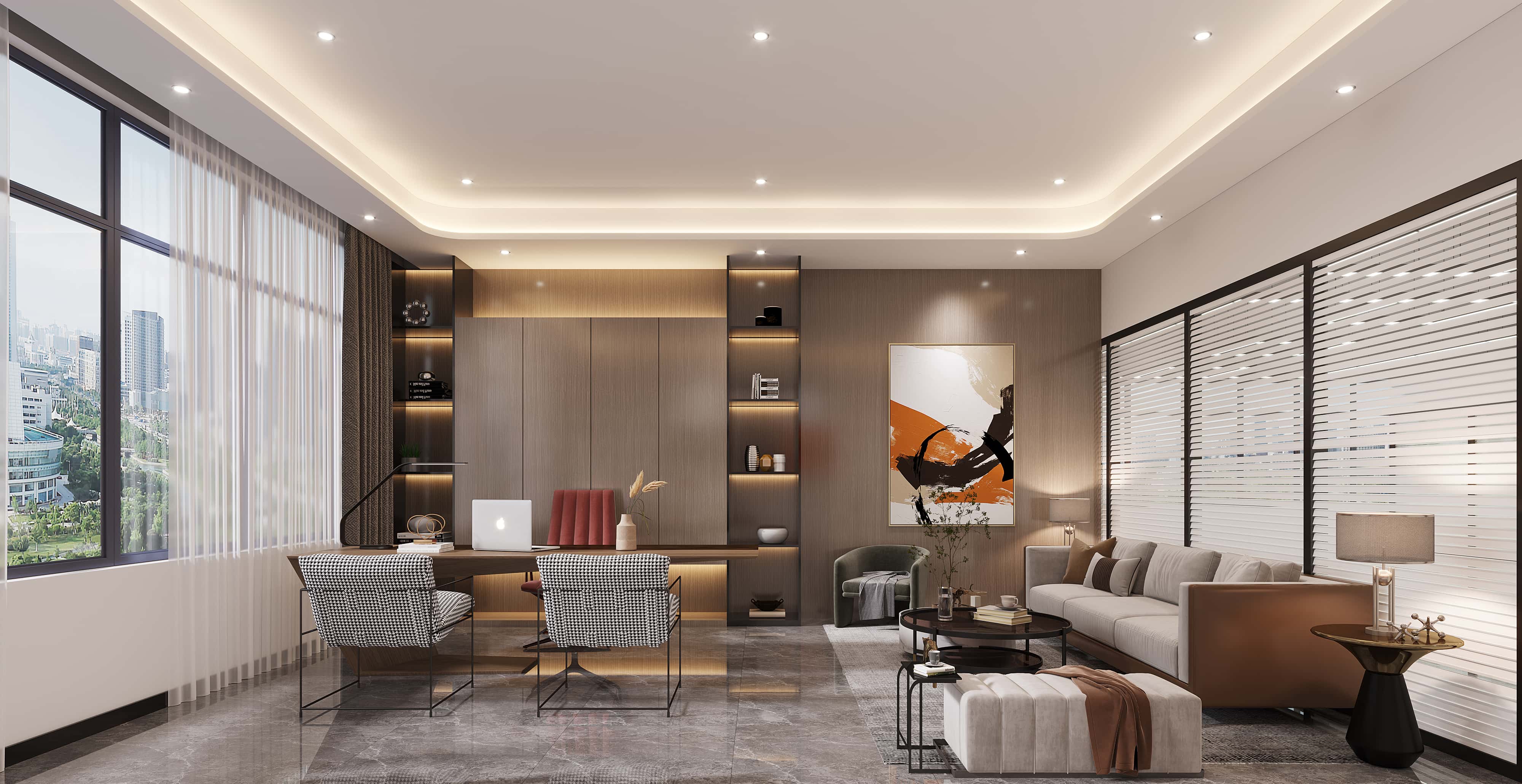 辦公家具選擇簡約時尚的款式,辦公桌、辦公椅及沙發(fā)等家具的顏色搭配和諧,營造出舒適的辦公氛圍。書架上擺放的裝飾品和書籍,豐富了空間的文化內(nèi)涵,展現(xiàn)出企業(yè)的品味與格調(diào)。