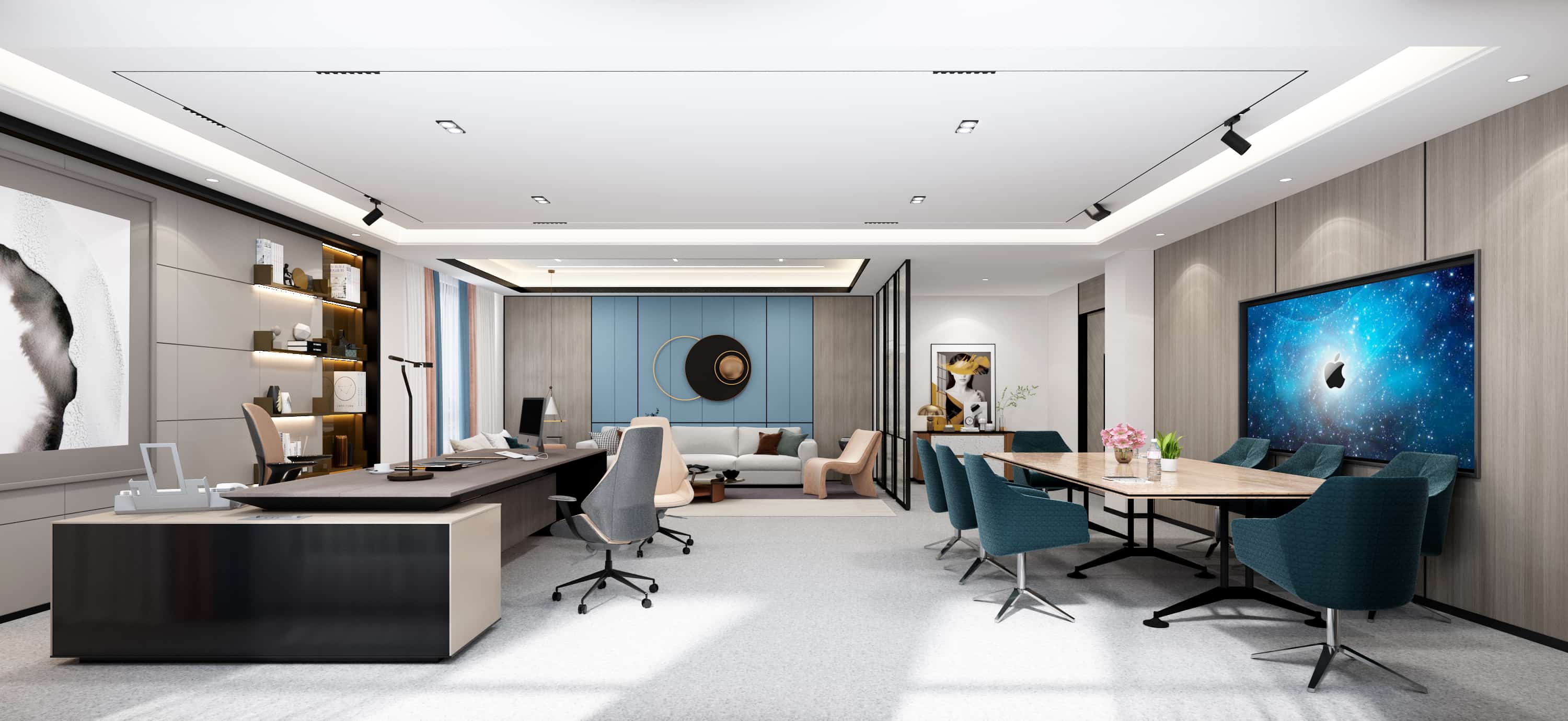 此辦公室空間寬敞,功能分區(qū)明確。整體色調(diào)以灰色、米色和藍色為主,營造出沉穩(wěn)而不失活力的氛圍。辦公區(qū)的辦公桌造型簡約現(xiàn)代,黑色的辦公桌搭配灰色和米色的辦公椅,舒適且實用。