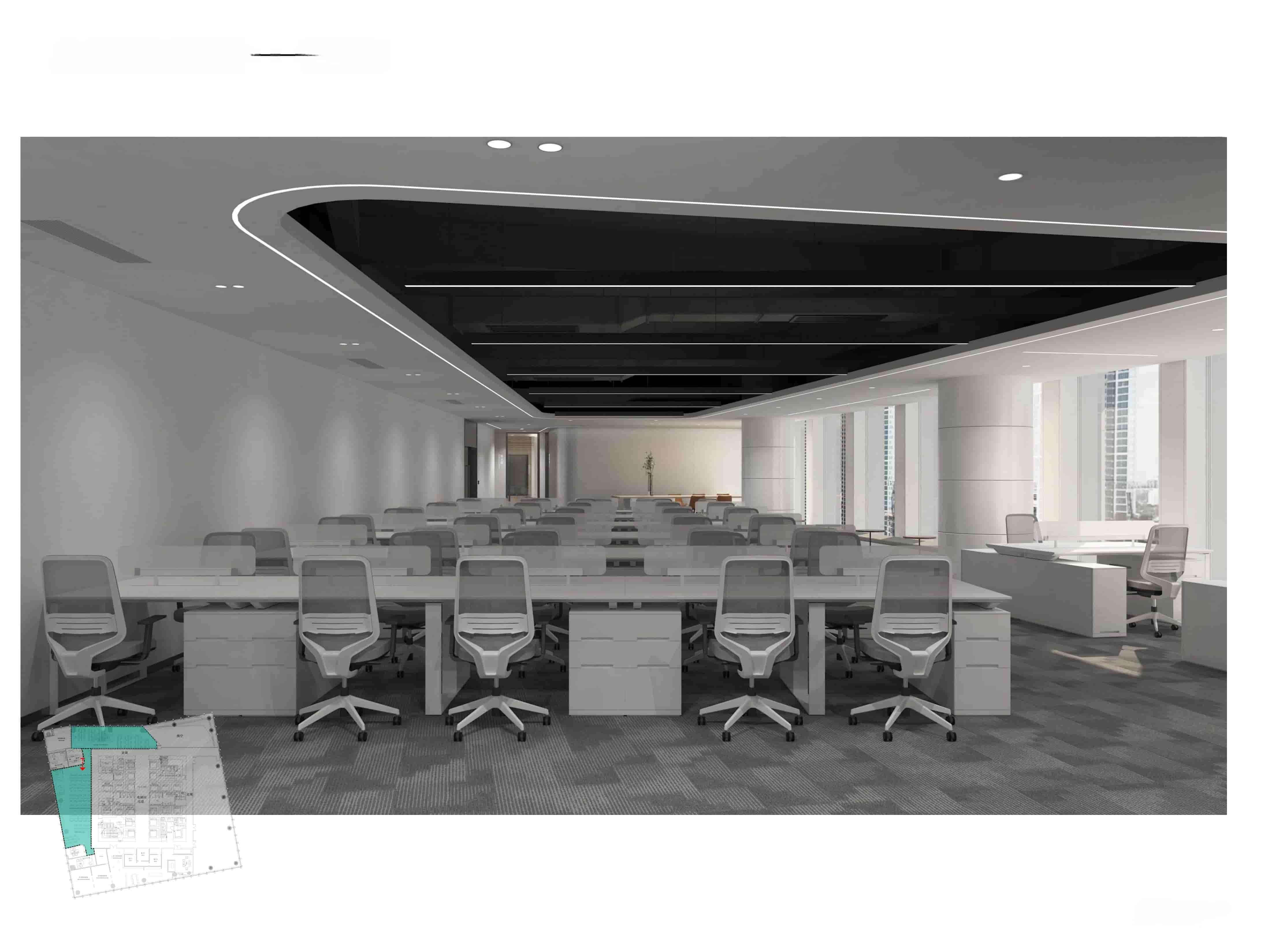 本設(shè)計為公司辦公區(qū)域,整體風(fēng)格簡約現(xiàn)代。營銷部以白色為主色調(diào),搭配灰色地毯,營造簡潔明亮氛圍。大面積辦公桌椅滿足多人辦公需求,天花板獨特的黑色區(qū)域與白色燈帶設(shè)計,增添空間層次感與科技感。南入口處設(shè)置長桌與舒適座椅,兼具臨時工位與接待功能,窗外城市景觀引入自然光線與開闊視野。臨時工位及接待區(qū)同樣簡潔實用,綠植點綴增添生機與活力。材質(zhì)選用環(huán)保耐用,燈光設(shè)計柔和明亮,旨在打造一個舒適、高效且富有活力的辦公環(huán)境,提升員工工作體驗與企業(yè)形象。