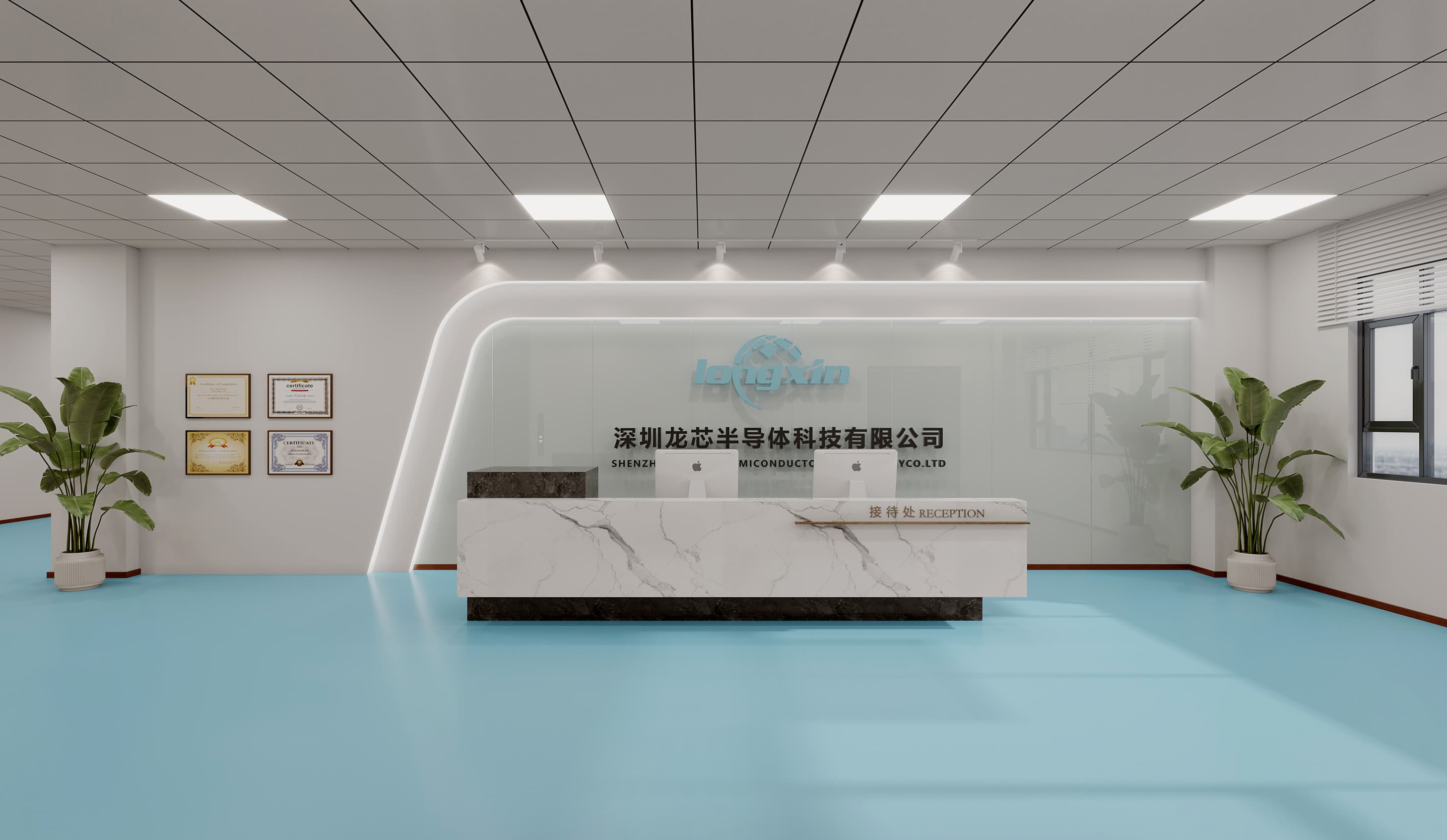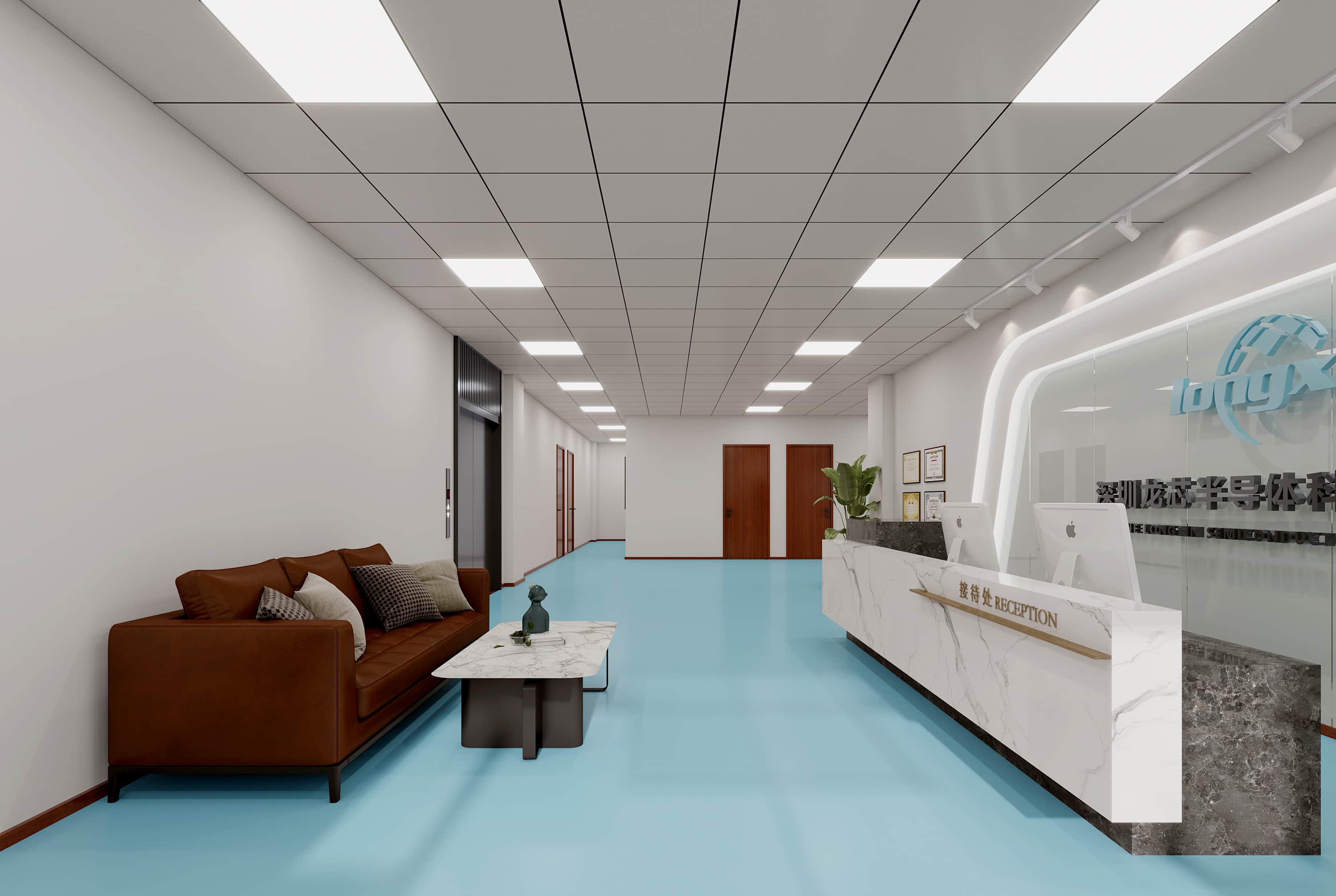 前臺區(qū)域,白色墻面搭配弧形玻璃背景墻,簡潔大氣,公司標識醒目,彰顯企業(yè)形象。地面采用淺藍色,增添空間活力。辦公區(qū),白色天花板與墻面營造明亮氛圍,木質(zhì)隔斷與辦公桌增添溫馨感,綠植點綴生機盎然。休息區(qū),棕色沙發(fā)搭配簡約茶幾,提供舒適放松空間。整體設計注重空間利用與色彩搭配,通過簡潔線條與現(xiàn)代元素,創(chuàng)造一個高效、舒適且能激發(fā)員工創(chuàng)造力的辦公環(huán)境。