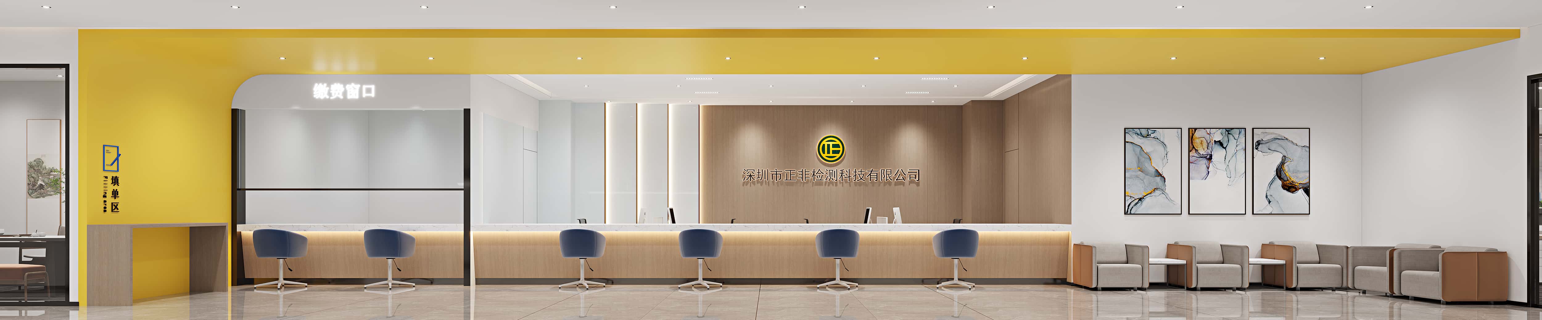 前臺(tái)區(qū)域,黃色墻面與木質(zhì)元素結(jié)合,醒目且溫馨,搭配現(xiàn)代感的接待桌椅與藝術(shù)畫作,彰顯企業(yè)形象。
