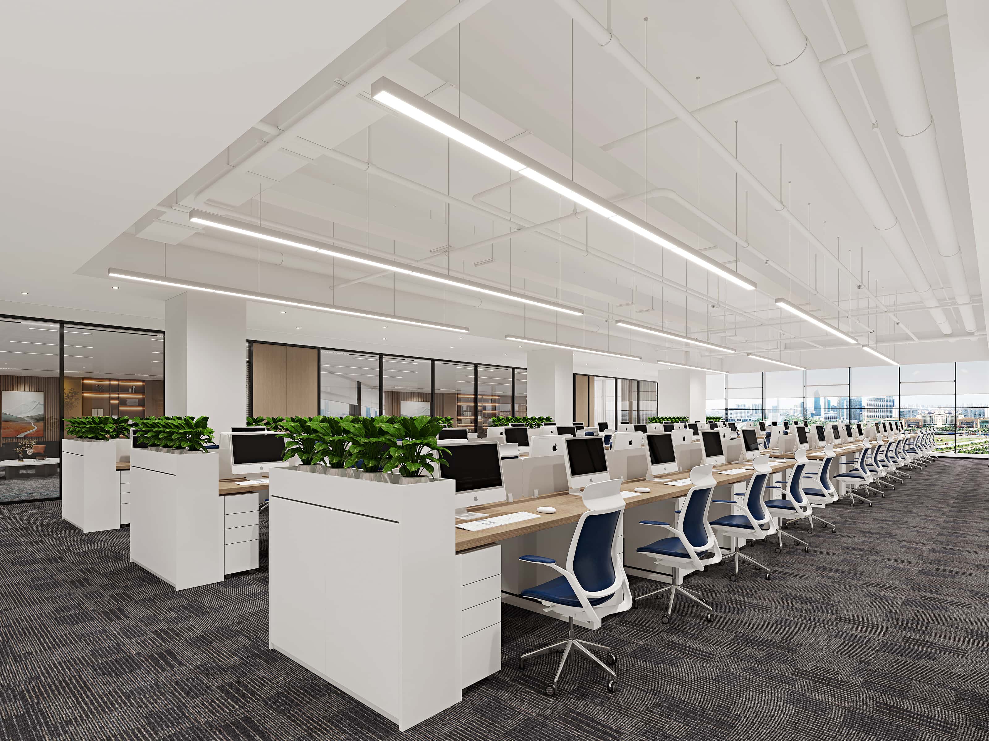 辦公區(qū),以白色為主色調(diào),簡(jiǎn)潔明亮,工位整齊排列,藍(lán)色辦公椅點(diǎn)綴其間,增添活力。頂部燈光設(shè)計(jì)合理,保證充足照明。