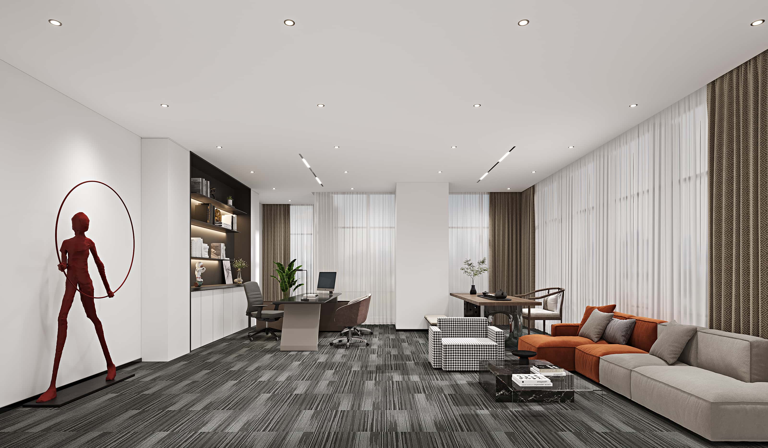 此外,還設(shè)有中式風(fēng)格的茶室,靜謐雅致,為員工提供放松交流的空間。整體設(shè)計(jì)通過色彩與功能區(qū)域的合理搭配,打造出一個(gè)舒適、高效且富有活力的辦公環(huán)境。
