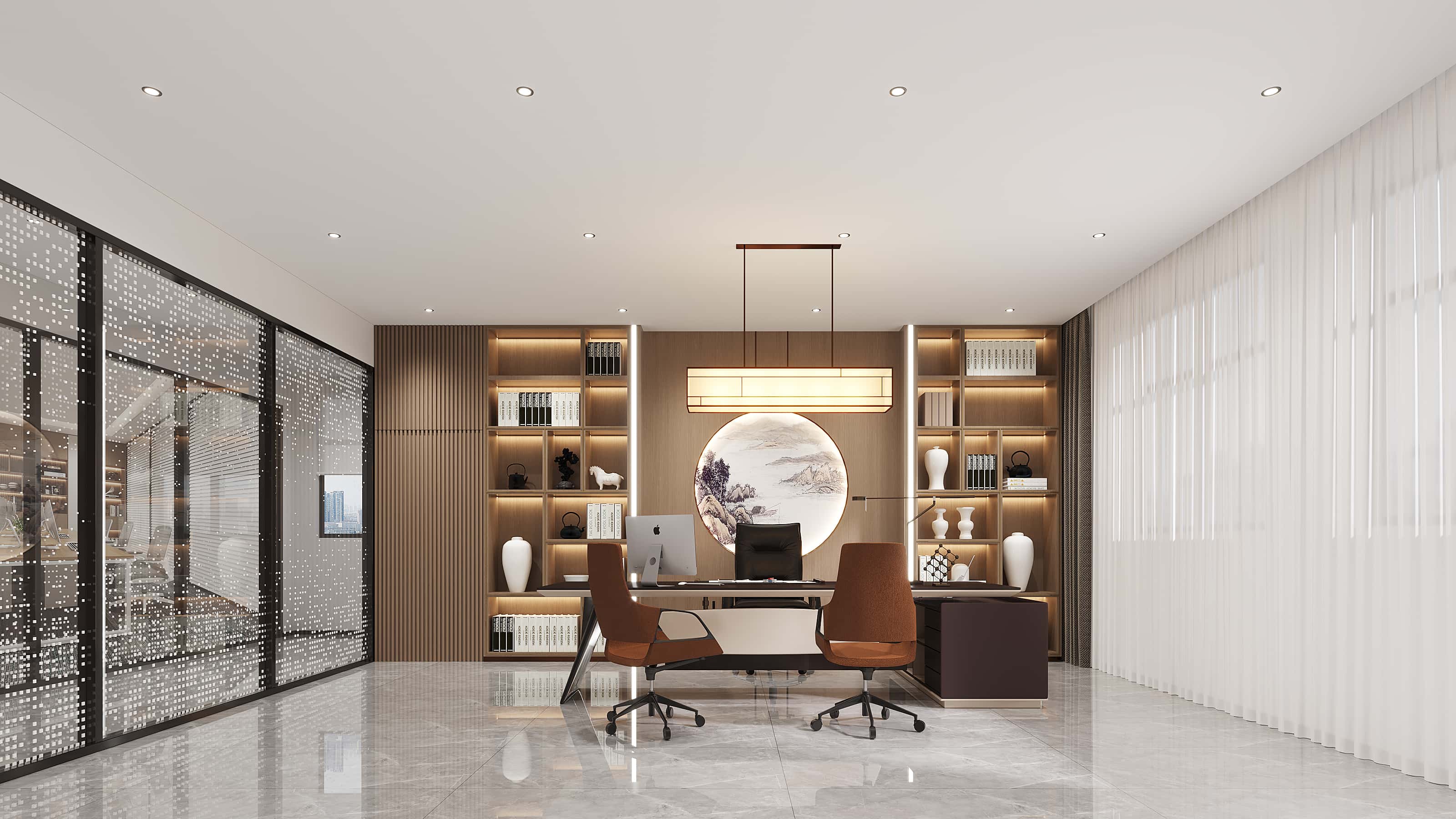 本辦公室設(shè)計融合現(xiàn)代與中式風(fēng)格,打造舒適且富有格調(diào)的辦公環(huán)境。