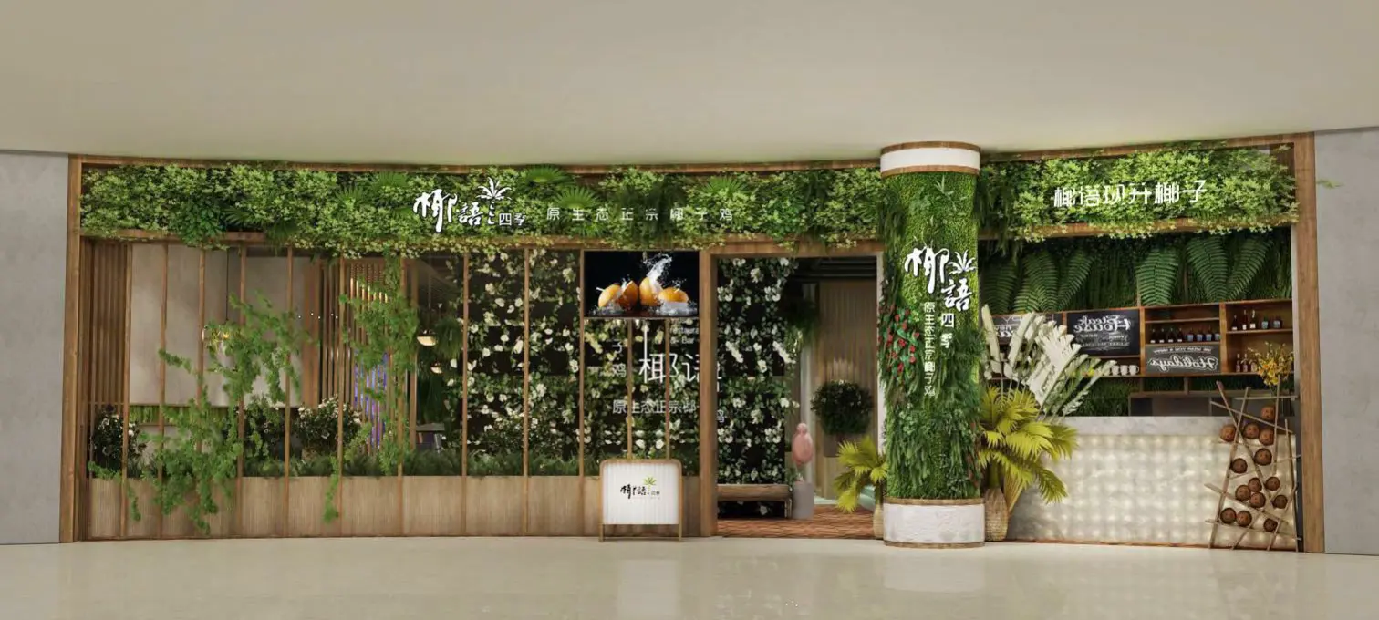 店面外觀,綠植覆蓋的墻面與木質(zhì)框架結(jié)合,營造出原生態(tài)氛圍,吸引顧客目光。