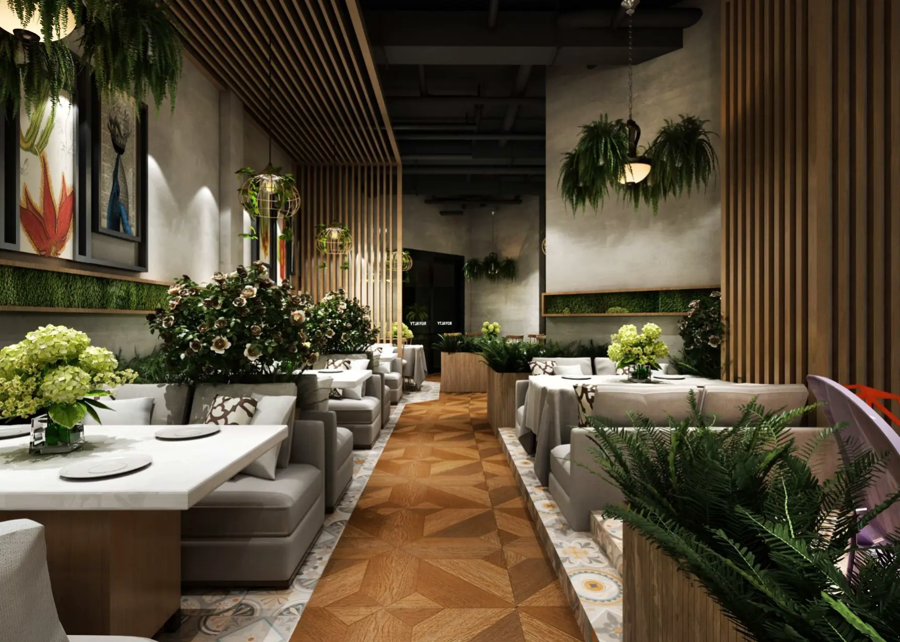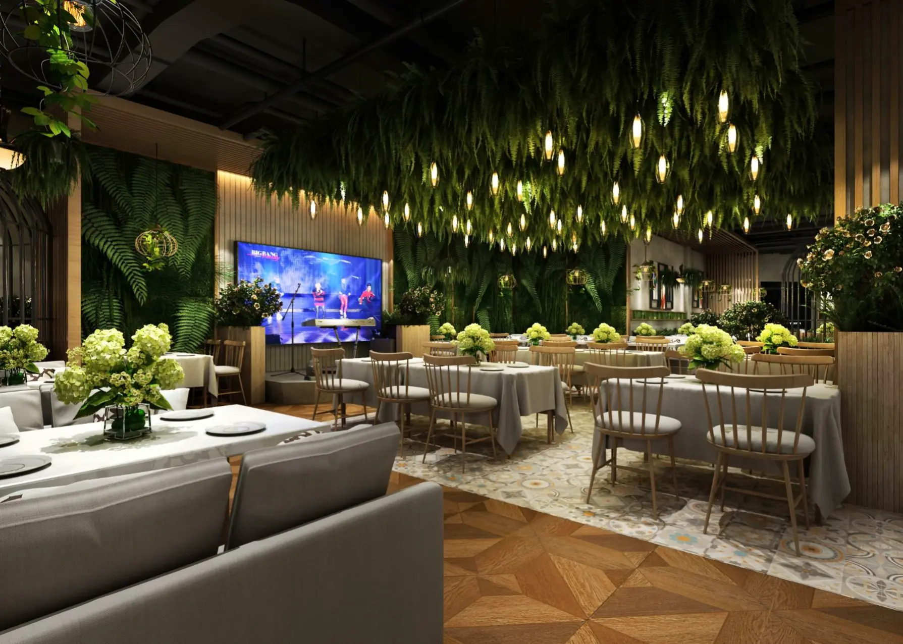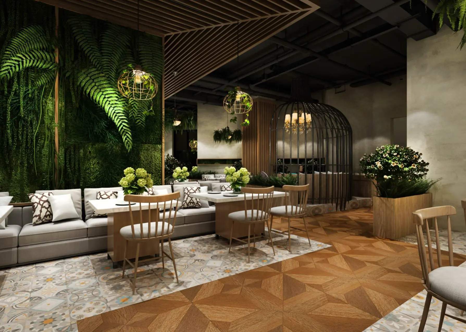 室內(nèi)空間,大面積的綠植墻搭配垂吊綠植,仿若置身熱帶雨林。地面采用木質(zhì)地板與花紋地磚拼接,增添空間層次感。桌椅以淺色系為主,搭配綠植裝飾,舒適且清新。燈光設計別具匠心,如垂吊的燈泡與鳥籠造型吊燈,柔和溫馨,與綠植相得益彰。