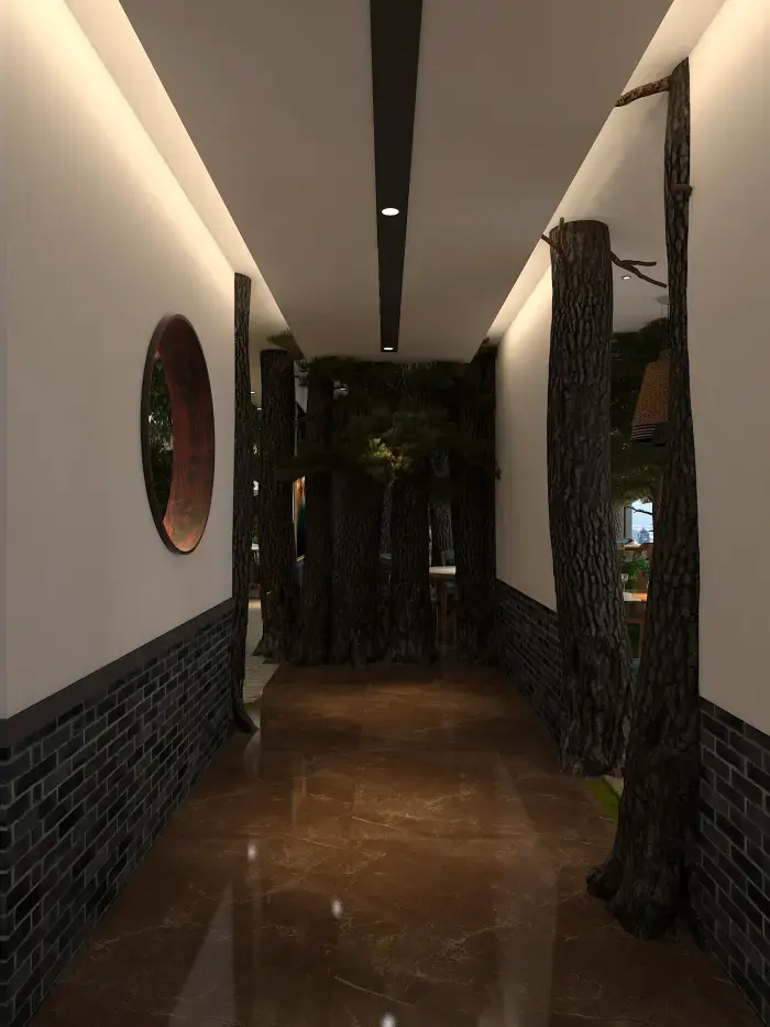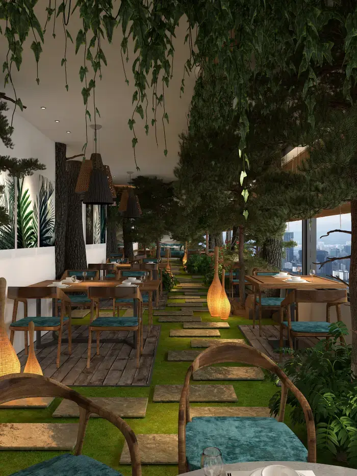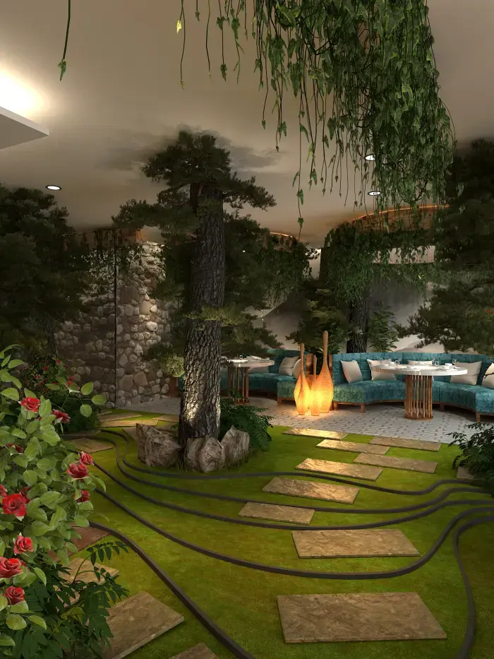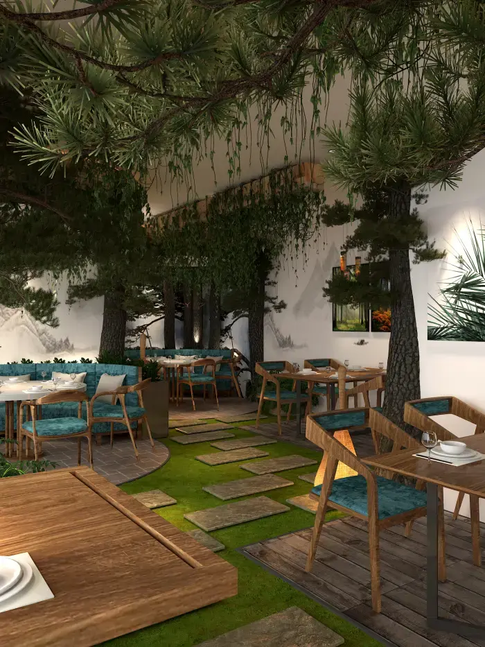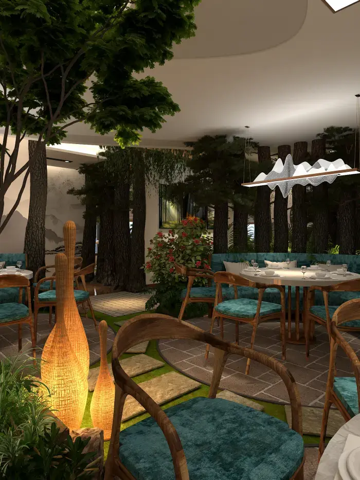 空間內(nèi)大量運(yùn)用仿真樹木、綠植與山石,營(yíng)造出濃郁的森林氛圍。地面鋪設(shè)草坪與石板路,仿佛置身林間小徑。桌椅選用木質(zhì)材質(zhì),搭配藍(lán)綠色坐墊,清新自然。墻壁上的山水畫作與植物裝飾畫,進(jìn)一步強(qiáng)化了自然主題。