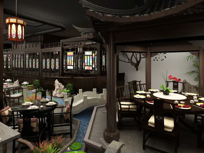 整體設(shè)計(jì)通過對中式元素的巧妙運(yùn)用,打造出一個兼具觀賞性與實(shí)用性的中式餐廳,讓顧客在品嘗美食的同時,能深切感受到濃郁的中式傳統(tǒng)文化氛圍,享受一場視覺與味覺的盛宴。