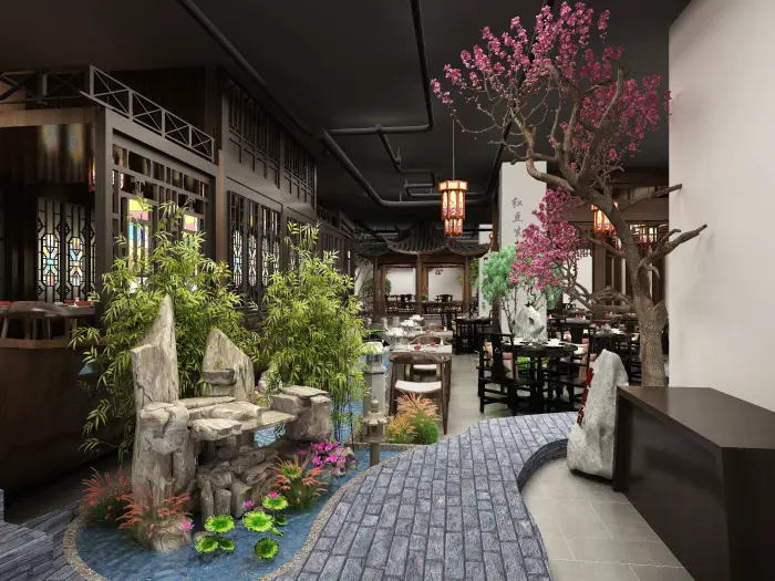 空間布局上,巧妙融入亭臺樓閣、小橋流水等元素,營造出移步換景的園林意境。青磚鋪地,搭配潺潺流水與假山綠植,仿若置身江南水鄉(xiāng)。