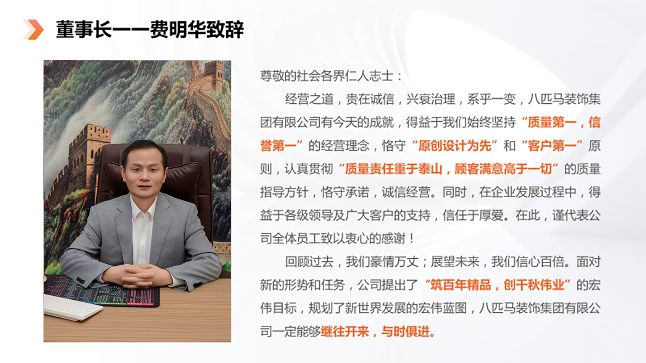 廣東八匹馬建設裝飾集團有限公司始建于2013年(簡稱“八匹馬裝飾”)是一家大型現(xiàn)代化全產(chǎn)業(yè)鏈裝飾企業(yè),注冊資本13800萬元。歷經(jīng)十余年的穩(wěn)健發(fā)展,八匹馬裝飾已集裝飾、培訓,設計、施工、材料、售后為一體的全國知名標桿裝飾企業(yè),多年來八匹馬堅持“規(guī)范化,專業(yè)化,集團化”的發(fā)展道路,信守”忠誠,務實,溝通“穩(wěn)健的經(jīng)營之道。恪守“原創(chuàng)設計為先”和“客戶第一”原則,深受廣大客戶,政府主管部門,行業(yè)協(xié)會,媒體等社會各界的高度認同與信賴,先后榮獲國家設計與施工二級資質(zhì)、全國裝飾優(yōu)秀標兵企業(yè)、中國建筑裝飾行業(yè)質(zhì)量與服務誠信企業(yè)、廣東省著名商標企業(yè)等眾多殊榮,在裝飾設計行業(yè)領先全國的深圳特區(qū),更被譽為裝飾行業(yè)知名標桿品牌。